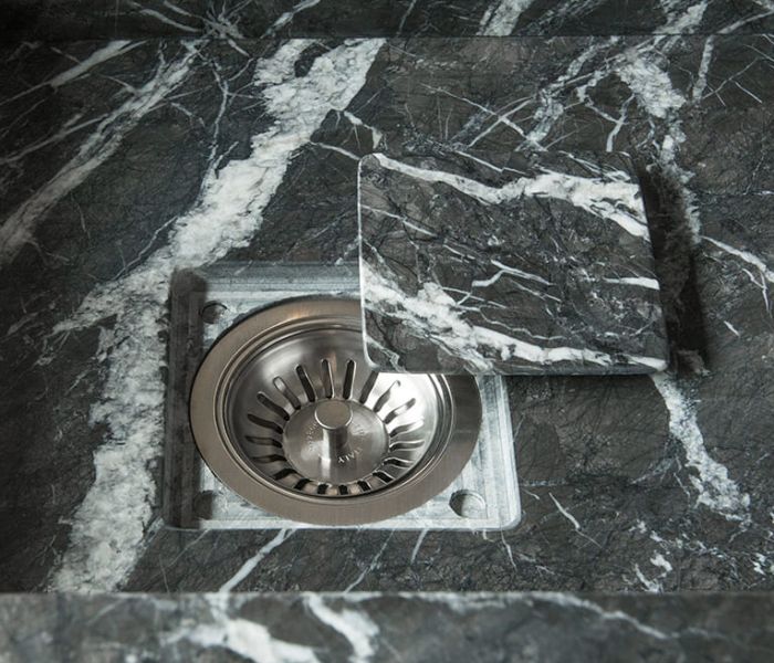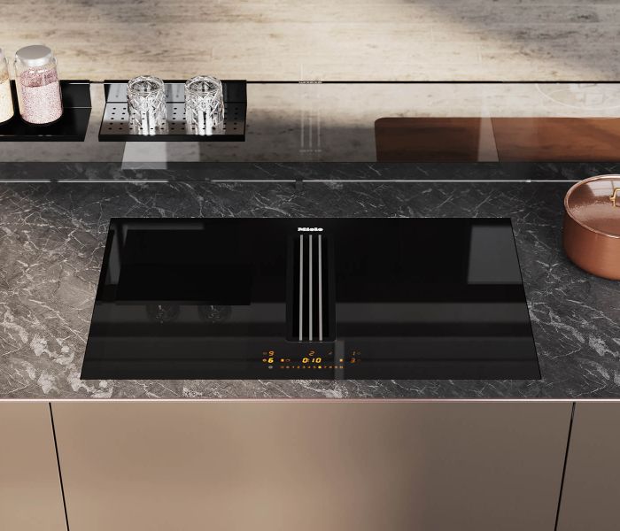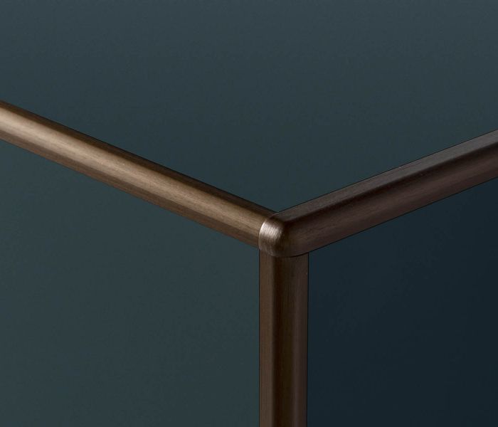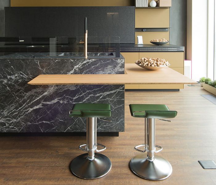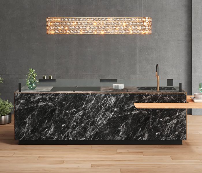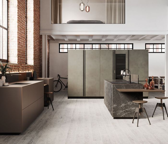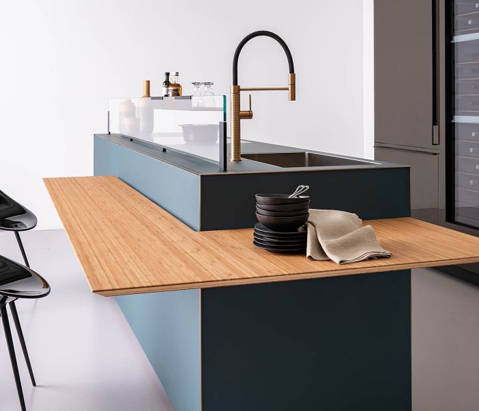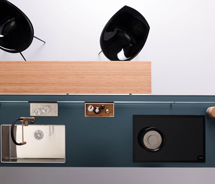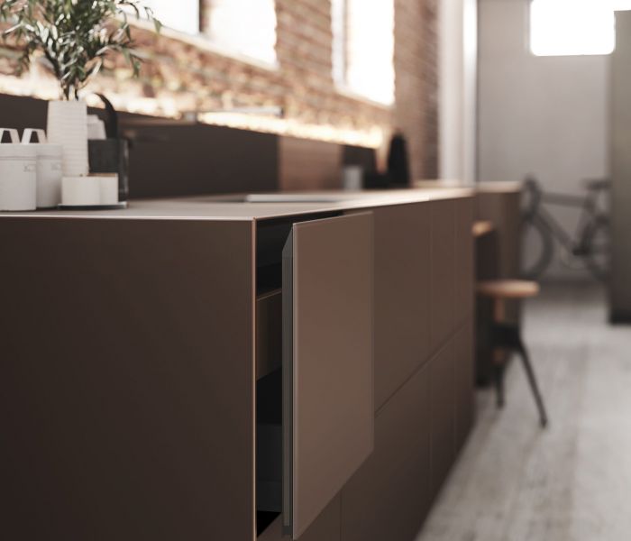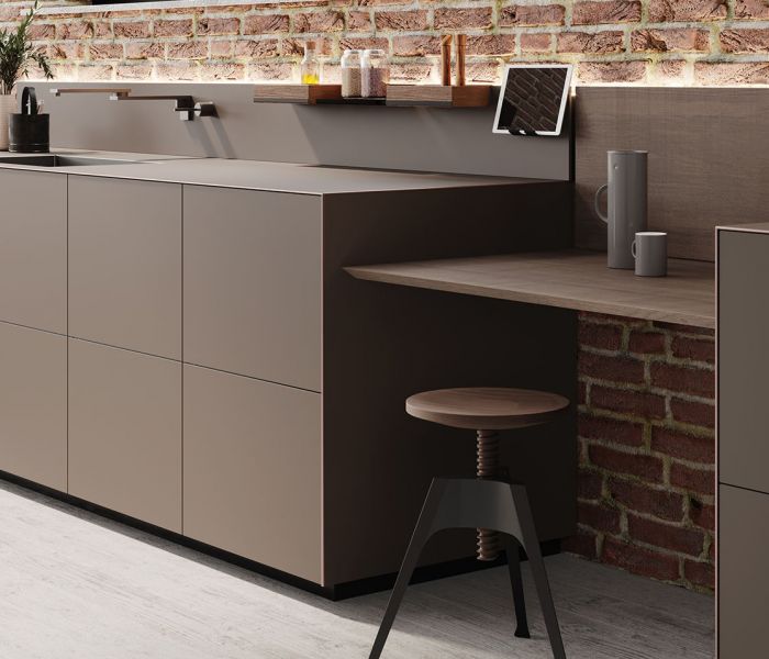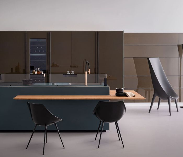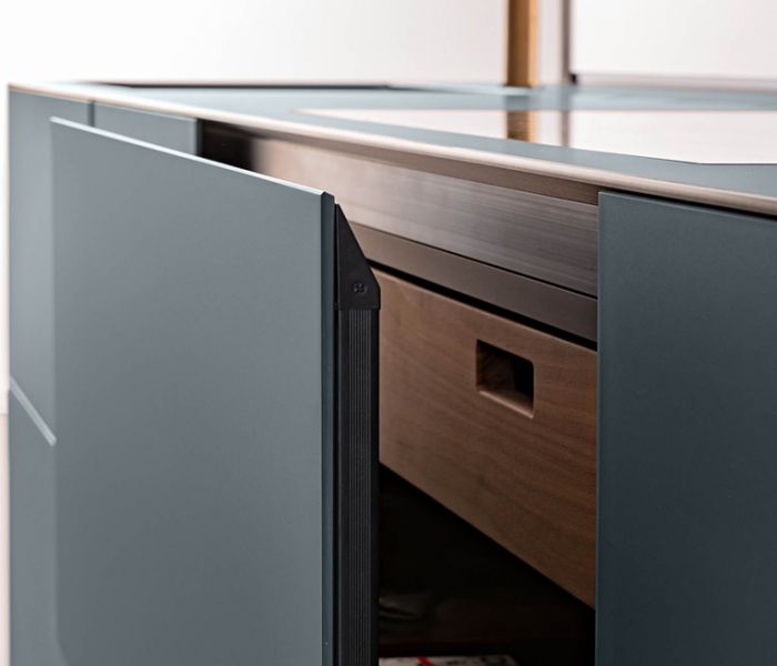 Artematica Soft Outline — воплощение чистого объёма. Единый блок, в котором столешница, дверцы и панели образуют целостную композицию, дополненную контрастным металлическим профилем.