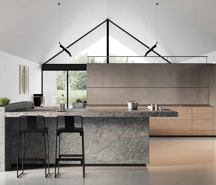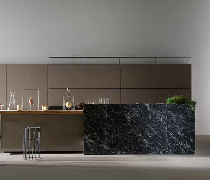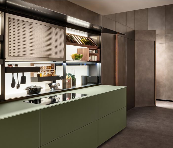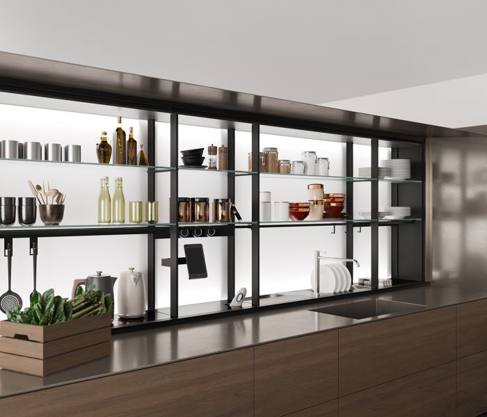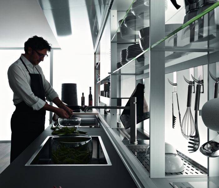 Рестайлинг системы выделяет три ключевые зоны: приготовление, мойка и подготовка, дополненные деревянными аксессуарами от Габриэле Чентаццо. Вертикальные открывающиеся панели обеспечивают мгновенный доступ к содержимому, сохраняя чистоту линий.