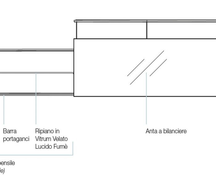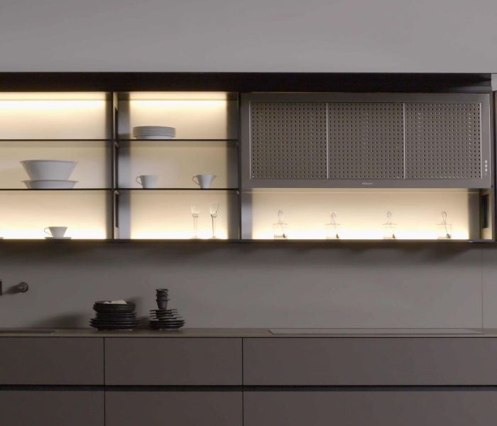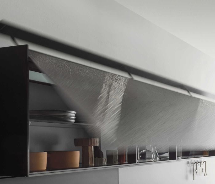 Каркас из алюминия сочетается со стеклянными полками, светодиодной подсветкой и системой креплений для дополнительных аксессуаров. Ключевой элемент системы — подвесная дверь, которая открывается усилием тяжести для широкого доступа. Легкое нажатие поднимает дверное полотно, где оно фиксируется в нужном положении на необходимое время.