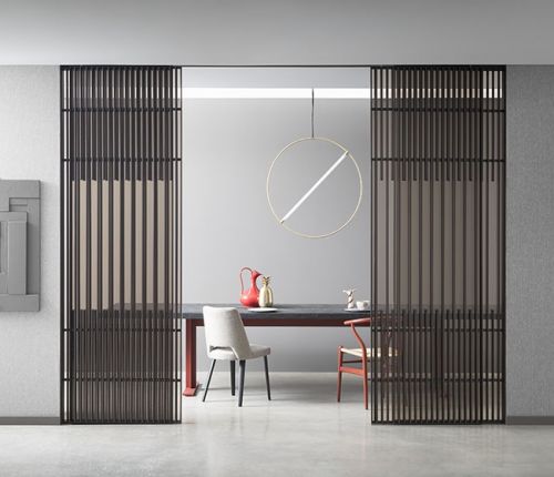 Koan сочетает в себе яркость и благородство стекла и металла с теплотой дерева, создавая идеальное сочетание технологий и традиций. Вертикальные планки из массива дерева подчеркивают ценность стеклянной панели, предлагая сценографическое представление пространства за дверью, а широкие возможности персонализации как в отделках так и в размерах делают эту модель бест-селлером среди перегородок для самых требовательных клиентов.