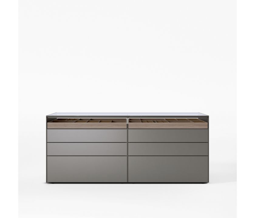 Внутри выдвижных полок предусмотрено место для специального оснащения, также выполненного из вяза, и дополненного контейнерами с множественными или поперечными разделителями, предназначенными для хранения очков, украшений, ремней и галстуков.