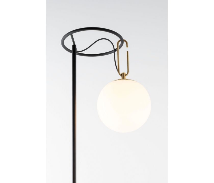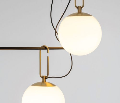 Сфера из белого дутого стекла скользит вдоль кольца из матовой латуни, что позволяет ему занимать различные положения и свободно регулировать и направлять диффузор. Рама становится опорой, крюком для подвешивания прибора к стене или ручкой, продвигающей взаимодействие со светом.